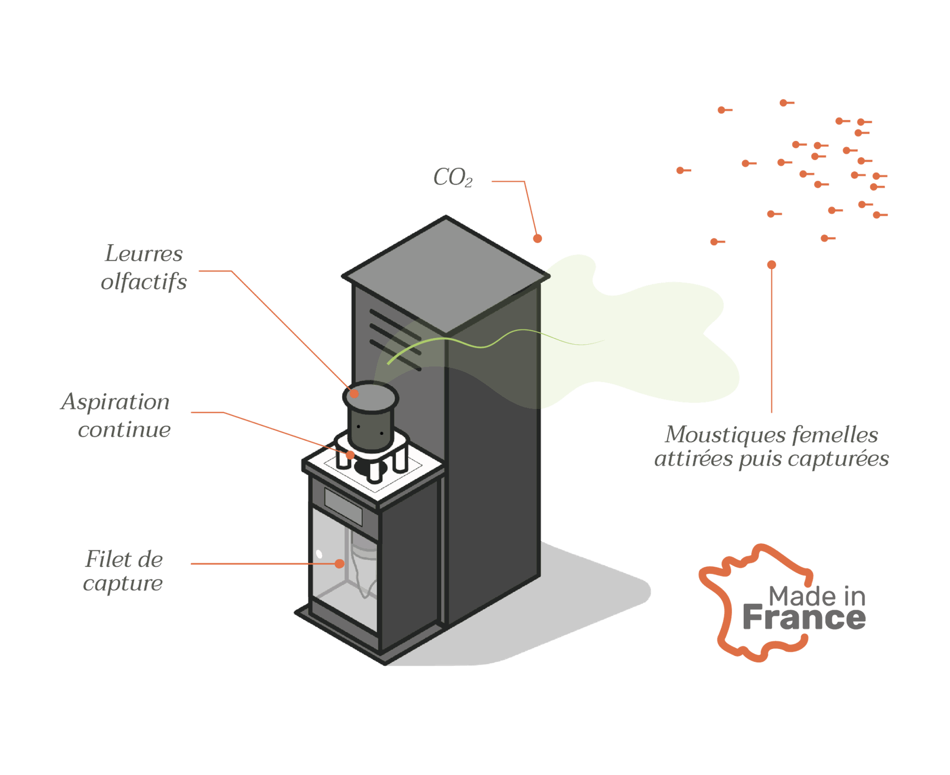 - Dispersion de dioxyde de carbone recyclé pour imiter la respiration humaine (attire le moustique)